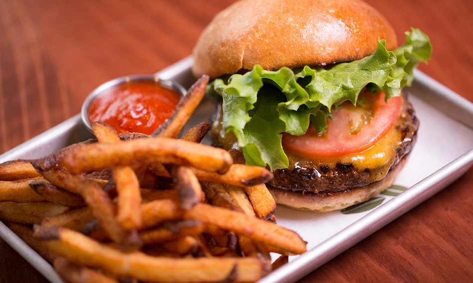 100% runderburger op een burger bun met cheddar, zoetzure ui, little gem en tomatenketchup, geserveerd met friet (eventueel met spek (+ €0,50) of een gebakken ei (+ €1,50))